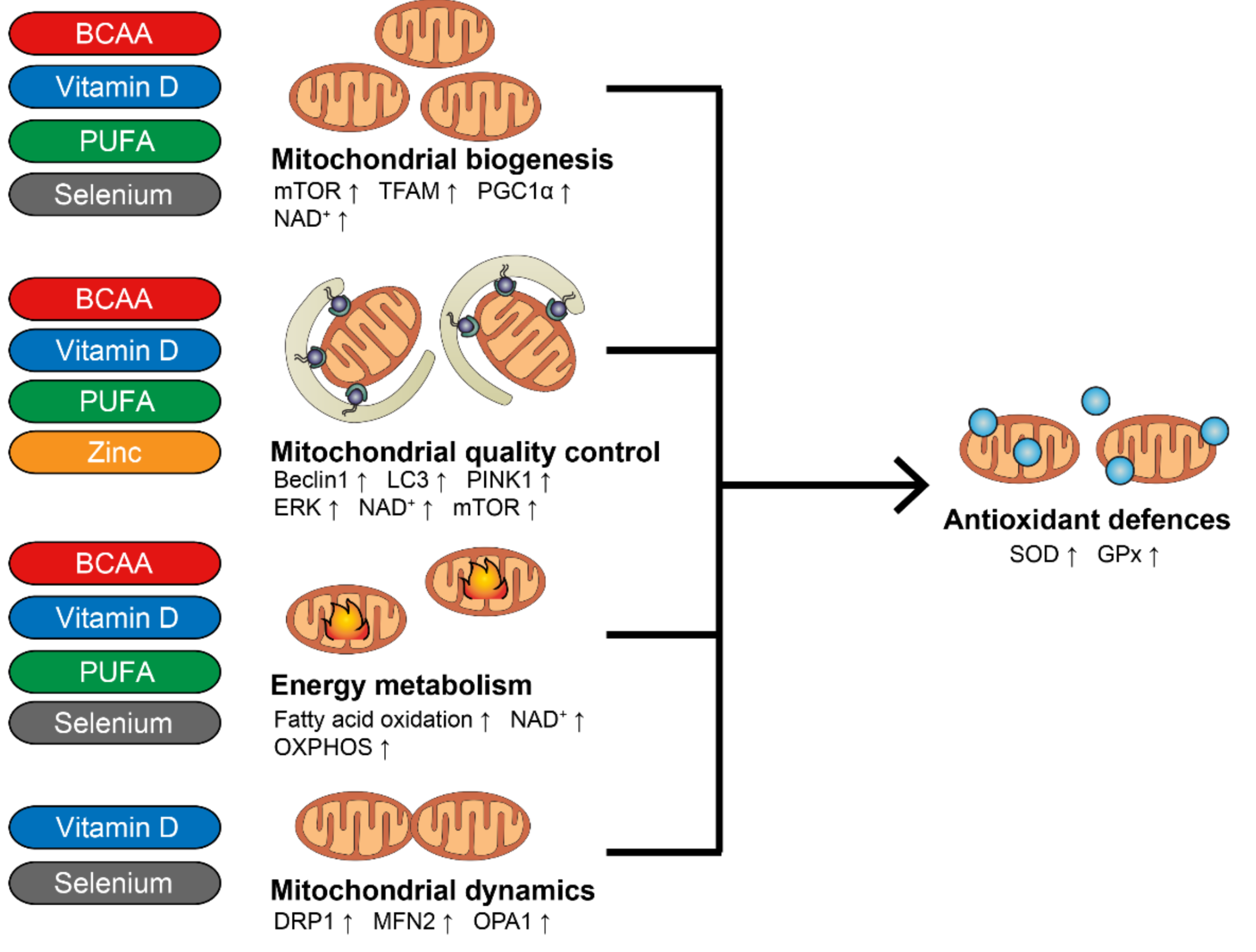 E' stato inoltre osservato invece come importanti nutrienti come VITAMINA D, OMEGA-3, e aminoacidi essenziali, possano aumentare le difese della cellula e aumentare quindi nuovamente la funzione mitocondriale